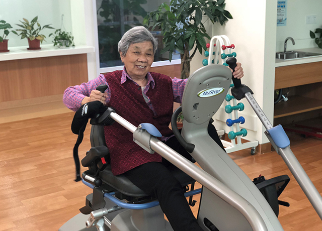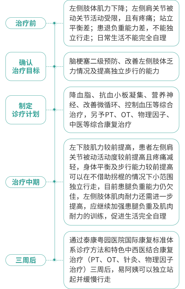 易阿姨今年81岁,入院前经泰康粤园医院多位康复专家、医生临床诊断为右侧基底节区脑梗塞恢复期;多发腔隙性脑梗塞;陈旧性前间壁心肌梗死;高血压病3级(极高危组);左侧肢体乏力4月,行走困难,需借助轮椅拐杖;日常生活自理能力轻度依赖。在泰康粤园医院经过短短的三周康复治疗,易阿姨可抛开轮椅、拐杖,自由行动。